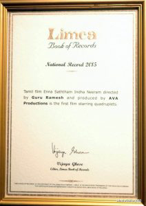 Limca Book Of World Record for introducing Quadruplets in the film Enna Saththam Indha Neeram