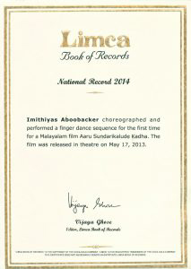 Limca Book Of World Record for introducing finger dance in Malayalam film Aaru Sundarimarude Kadha