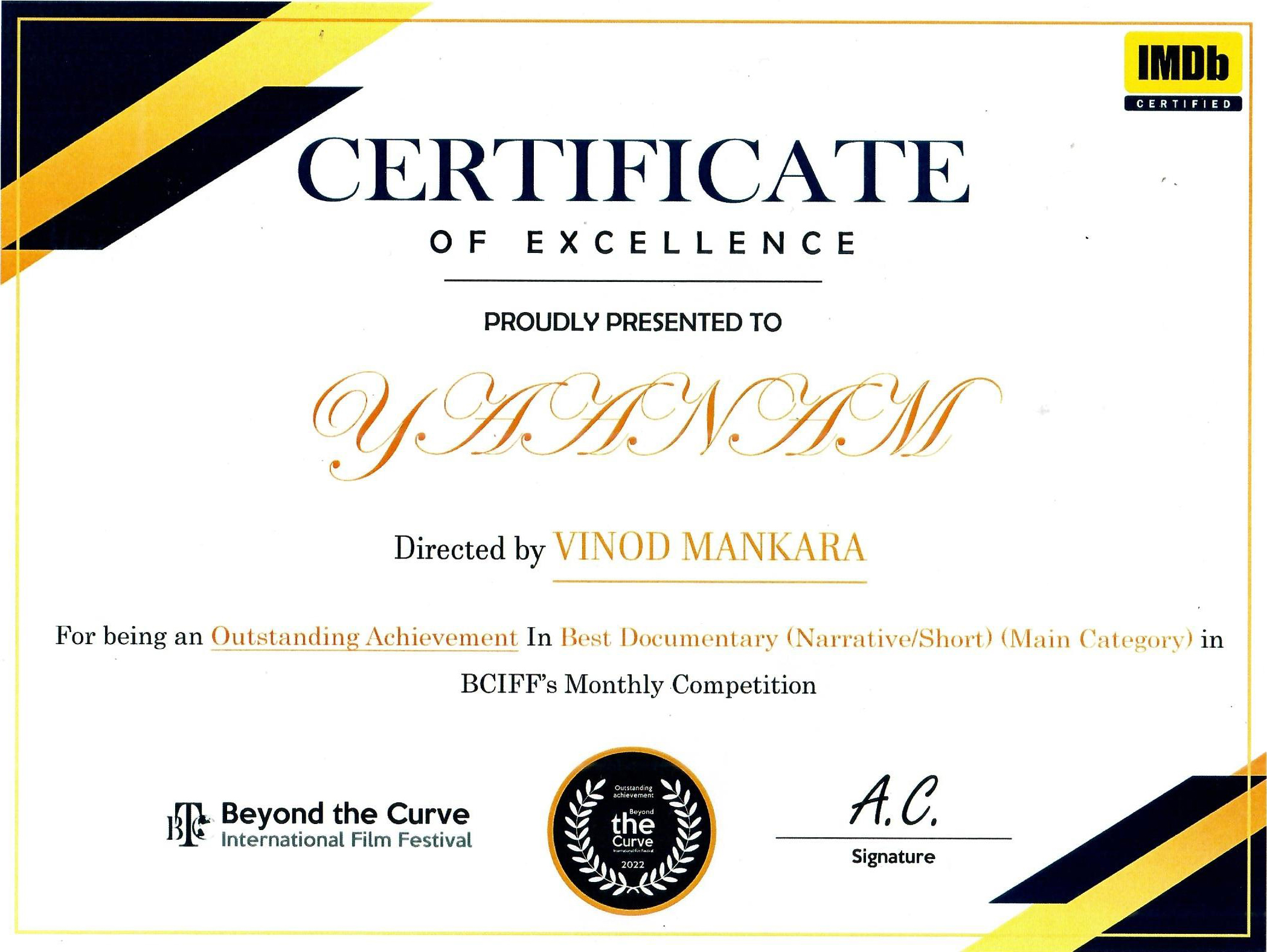 Yaanam – Nominee in Best Documentary -Beyond the Curve International Film Festival